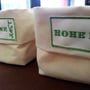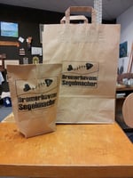 2012 haben wir uns entschieden, von Plastik auf recycelte Papiertragetaschen umzustellen, obwohl Papier immer noch teurer als Plastik ist. Die Tüten werden per Hand von uns liebevoll mit unserem Logo gestempelt und sind als Umverpackung der Renner.
